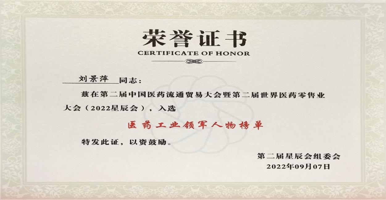 在本次开幕式上,发布了“医药工业领军人物”、“医药零售领军人物”榜单,壹号娱乐药业集团刘景萍董事长凭借在儿药领域多年的努力探索和对行业的杰出贡献,荣获“医药工业领军人物”称号。