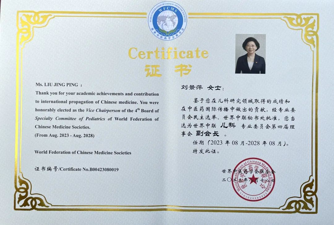 壹号娱乐药业集团党委书记、董事长刘景萍当选世界中医药学会联合会儿科专业委员会第四届理事会副会长